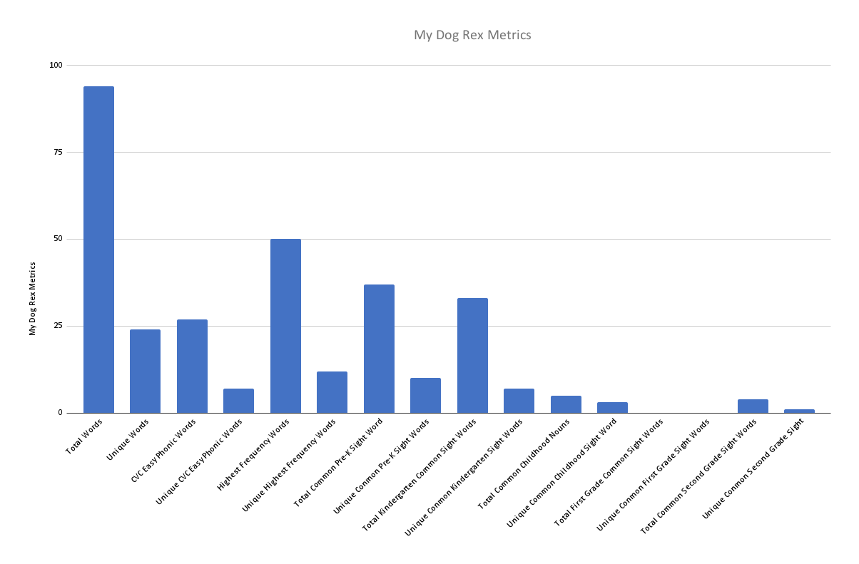 My Dox Rex is the fourth book and transition book in the series, which no longer includes within-text supports or prompts. This transition is facilitated by reducing the number of unique words and total words, to help keep confidence strong as these supports are faded. This book retains some predictability of sentence structure, while alternating directions of what to do versus what not to do. The illustrations increase slightly in difficulty again as well, as they become slightly more complex. In this book, the concept of imperative language is introduced in the form of giving commands, and the concept of negation is introduced (what not to do). The difficulty increases in this book with an increased number of kindergarten sight words (it has the most kindergarten sight words of all the books) and introduces a few second grade sight words. This book also introduces exclamation points as punctuation.