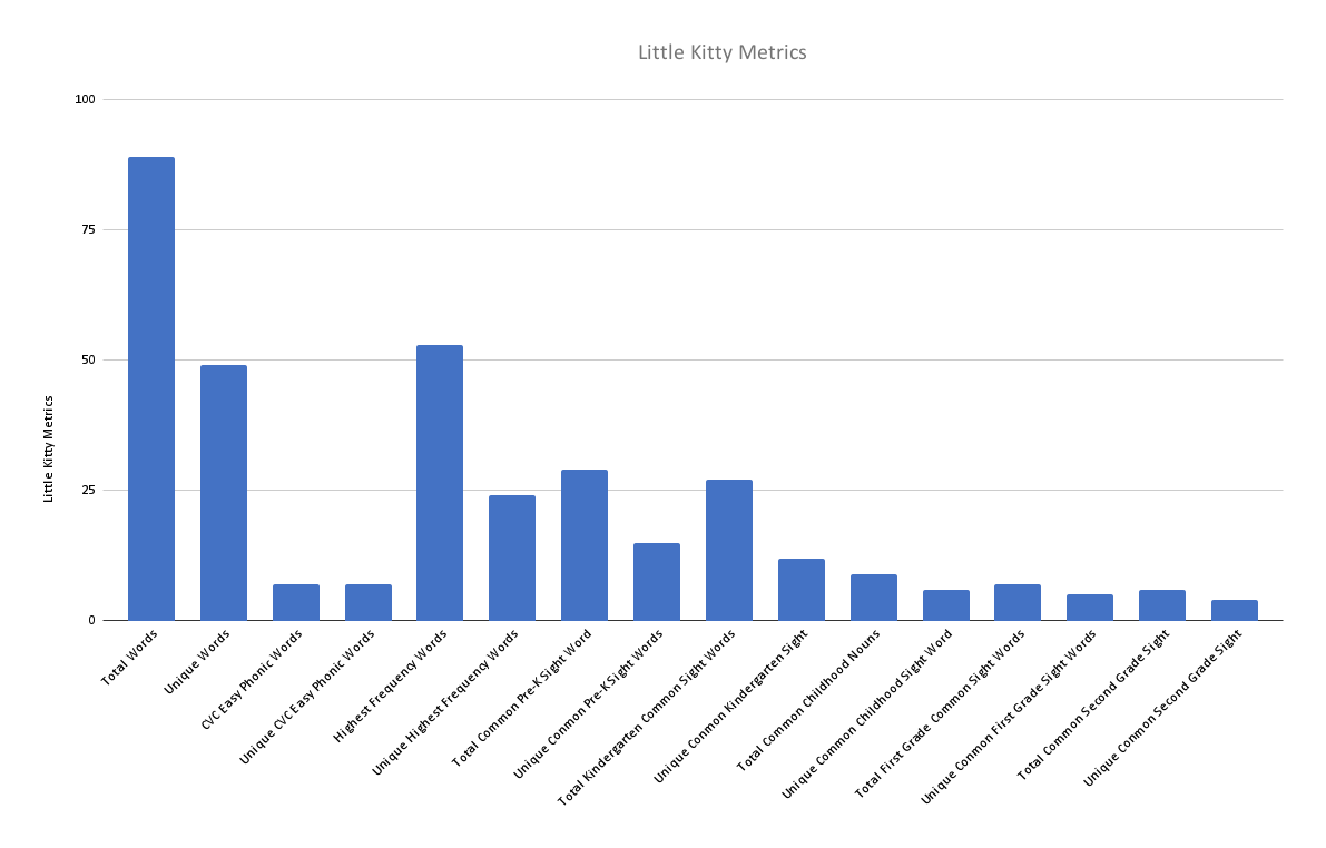In Little Kitty, the fifth and final book in the series, the difficulty level increases as there is an overall lower number of total words with the highest number of unique words. Being the hardest book in the series, it has the least repetitive and predictable phrase structure and has no within-text supports. In other words, the overall repetition and predictability decreases in this book along with a corresponding increase in the complexity of words and sentence structure. In this book, the difficulty level of the sight words rises as this book has the most unique common kindergarten, first grade, and second grade sight words. This book contains the highest number of total first and second grade sight words. Lastly, this book also introduces a semicolon as punctuation.